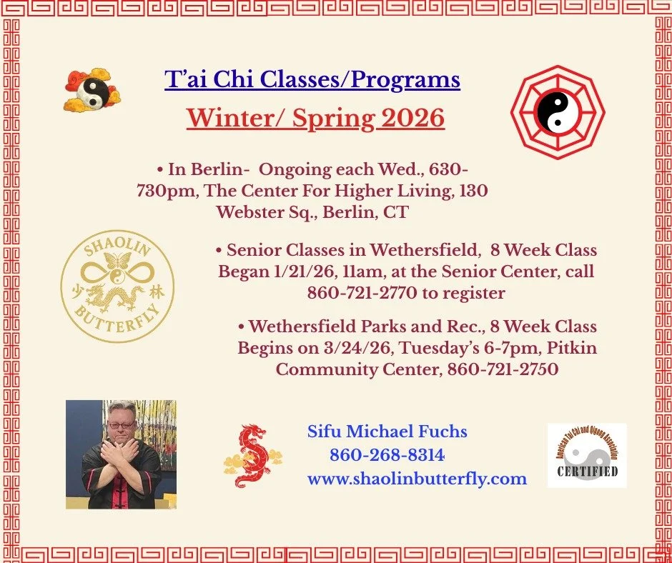 Welcome to Shaolin Butterfly, home of Shaolin Butterfly Integrative Healing and Wellness Arts and Shaolin Butterfly Martial Arts, serving the local central CT community, region, nation and beyond since 1997. We feature high quality Training, Classes, Workshops and Events in a variety of true lineage Asian Martial, Meditative, and Healing Arts, “Ancient Treasures For Modern Times.” Chief Instructor Sifu Michael Fuchs has over 35 years of experience sharing his arts with people of all ages and socio-economic backgrounds and many special needs groups. Whoever we are and wherever we come from these arts can enrich our lives in so many ways. Thank you for visiting and please CLICK the links to learn more and see our CLASS/EVENTS CALENDAR for ongoing and upcoming offerings.