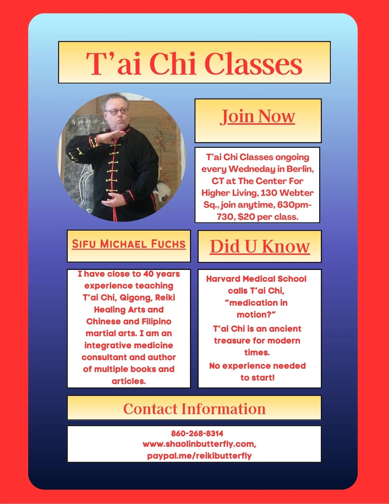 Welcome to Shaolin Butterfly, home of Shaolin Butterfly Integrative Healing and Wellness Arts and Shaolin Butterfly Martial Arts, serving the local central CT community, region, nation and beyond since 1997. We feature high quality Training, Classes, Workshops and Events in a variety of true lineage Asian Martial, Meditative, and Healing Arts, “Ancient Treasures For Modern Times.” Chief Instructor Sifu Michael Fuchs has over 35 years of experience sharing his arts with people of all ages and socio-economic backgrounds and many special needs groups. Whoever we are and wherever we come from these arts can enrich our lives in so many ways. Thank you for visiting and please CLICK the links to learn more and see our CLASS/EVENTS CALENDAR for ongoing and upcoming offerings.