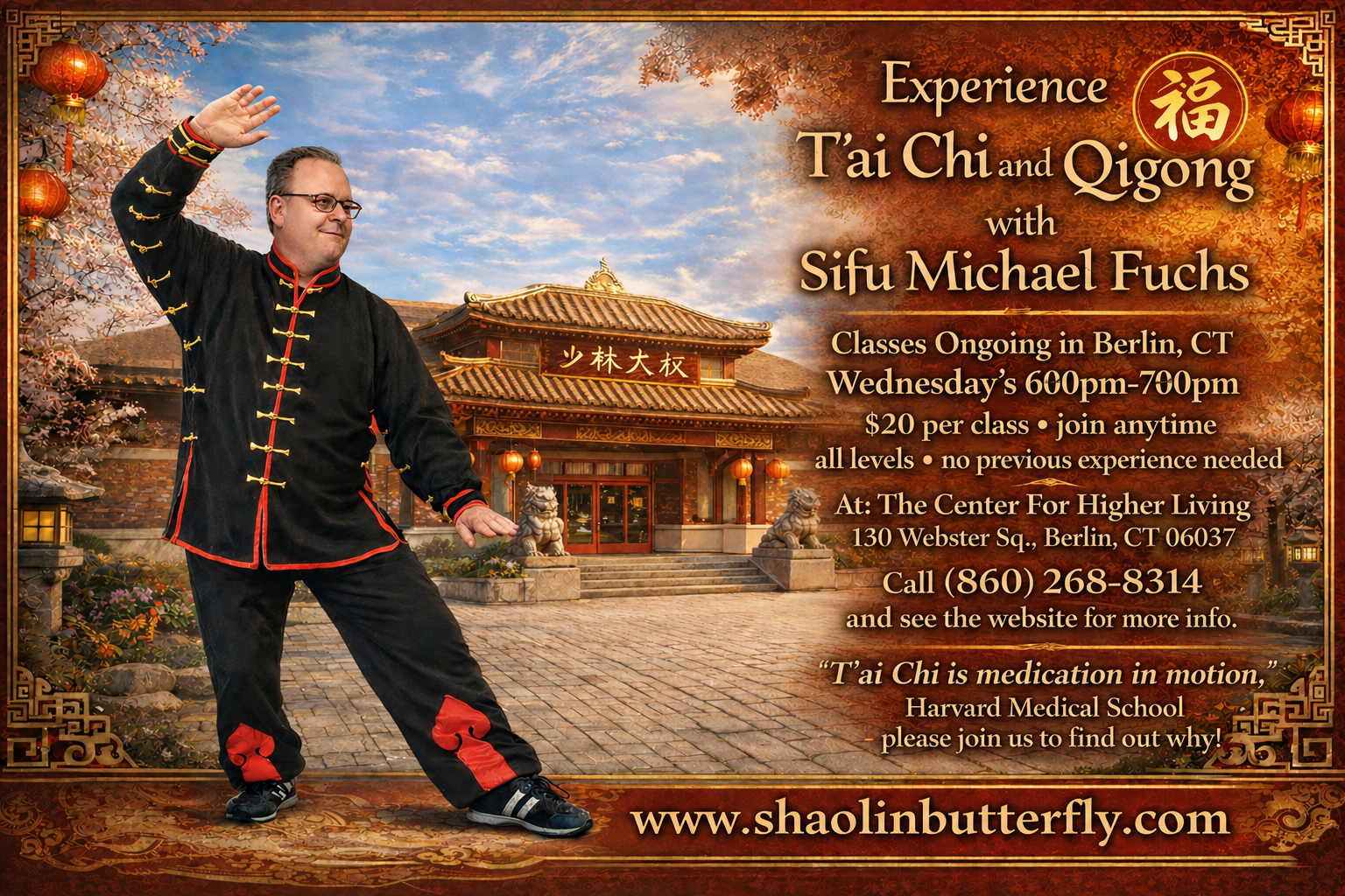 All are welcome to join us at the beautiful Pitkin Community Center in Wethersfield, CT for a public program in T’ai Chi and Qigong, sponsored by Wethersfield Parks and Recreation. See the flyer for details and to register- All Levels Welcome, no experience needed, wear comfortable clothes and shoes/sneakers. 8 week session, Tuesday 3/24/26- 5/19/26, no class on 4/14.