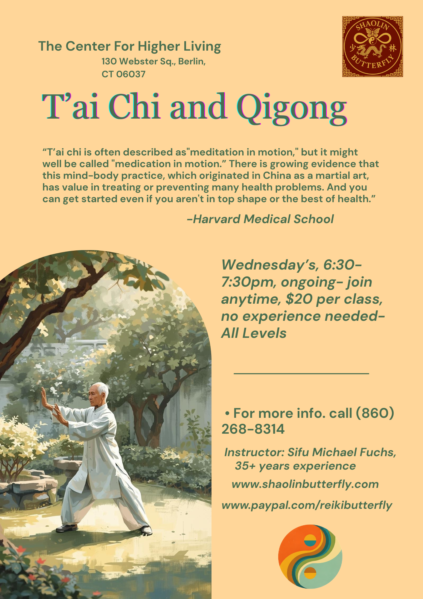 All are welcome to join us for Tai Chi and Qigong at the beautiful Center For Higher Living; they have a large, very comfortable space for tai chi/yoga and the like as well as private treatment rooms for reiki/massage/bodywork/energy work. All levels are welcome, $20 per class, PAYPAL.ME/REIKIBUTTERFLY, people can join anytime. Tai Chi is world renowned for promoting health and wellness, balance and harmony for spirit, mind, and body- we hope to see you there. See the Butterfly Tai Chi Portal for much more on Tai Chi Training, Concepts/Principles, Articles and Videos, Links and more.