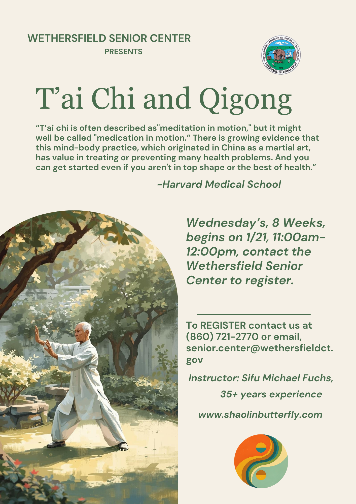 An 8 week session of T’ai Chi For Senior’s, age 55 and up, begins on 1/21 for an 8 week session, at Wethersfield Senior Center, 30 Greenfield St., Wethersfield, CT 06109. See the flyer for more info. including how to register and contact me for details. See you there!